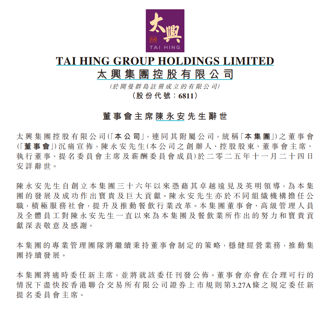 近期,知名连锁餐饮企业太兴集团在港交所发布公告称,太兴集团控股有限公司创办人、控股股东兼董事会主席陈永安于11月24日安详辞世,享年66岁。