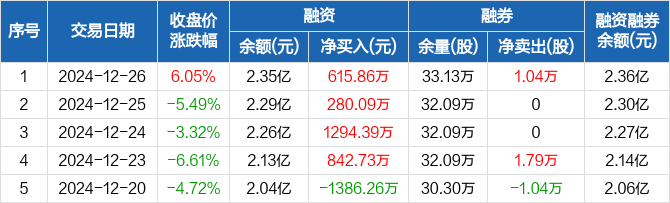 融资方面,当日融资买入3565.02万元,融资偿还2949.16万元,融资净买入615.86万元,连续4日净买入累计3033.08万元。融券方面,融券卖出1.04万股,融券偿还0股,融券余量33.13万股,融券余额145.11万元。融资融券余额合计2.36亿元。