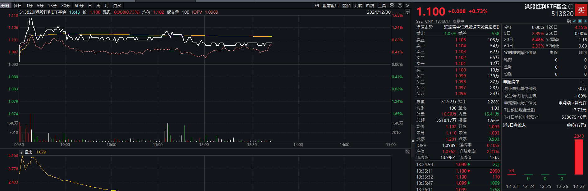 港股红利ETF基金(513820)逆市飘红,民生银行H股涨超2%,机构:港股红利指数普遍可以跑赢宽基指数