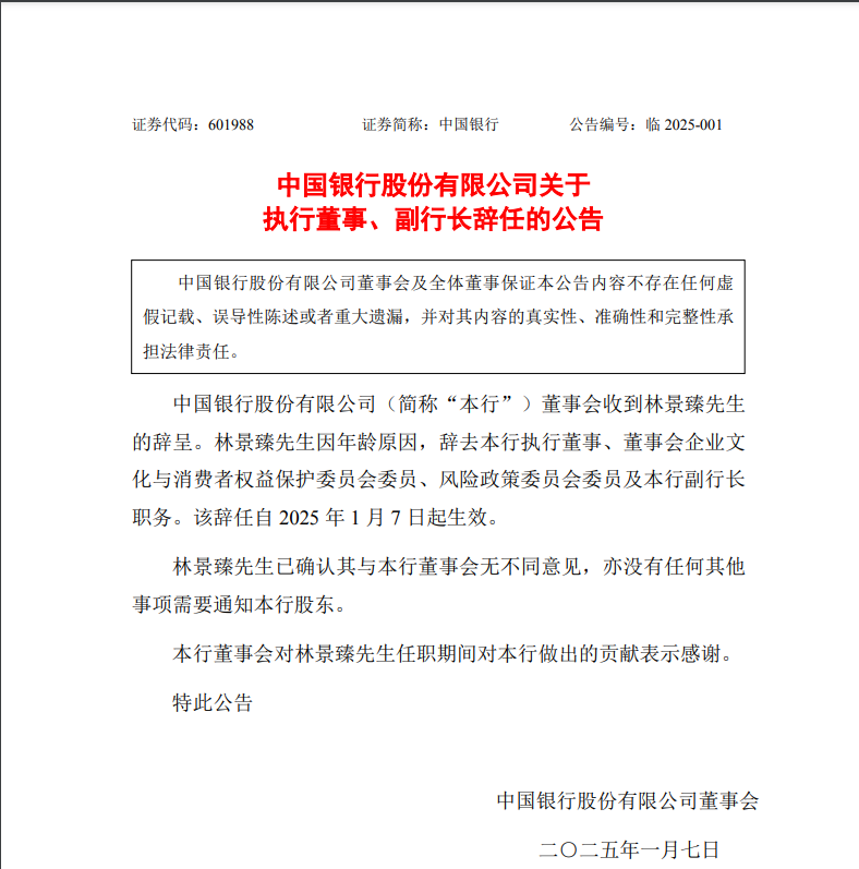 1月7日,中国银行(SH601988,股价:5.46元,市值:1.6万亿元)发布公告称,该行董事会收到林景臻的辞呈,因年龄原因,辞去该行执行董事、董事会企业文化与消费者权益保护委员会委员、风险政策委员会委员及副行长职务。该辞任自2025年1月7日起生效。