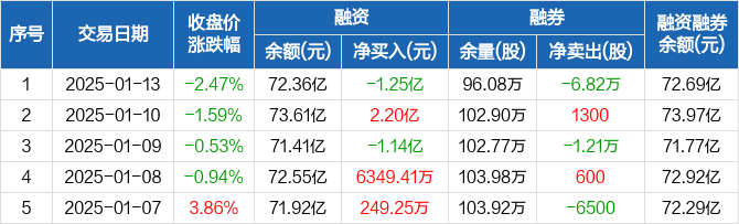 江淮汽车融资融券信息显示,2025年1月13日融资净偿还1.25亿元;融资余额72.36亿元,较前一日下降1.7%。