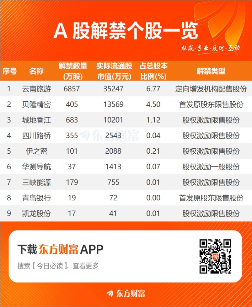 从解禁市值看,东方财富Choice数据显示,明日面临解禁的9只股票中,云南旅游、贝隆精密、城地香江居前,解禁市值分别为3.52亿元、1.36亿元、1.02亿元。解禁比例方面,云南旅游、贝隆精密、城地香江分别为6.77%、4.50%、1.12%,居于前列。
