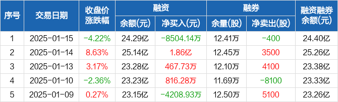 指南针融资融券信息显示,2025年1月15日融资净偿还8504.14万元;融资余额24.29亿元,较前一日下降3.38%。
