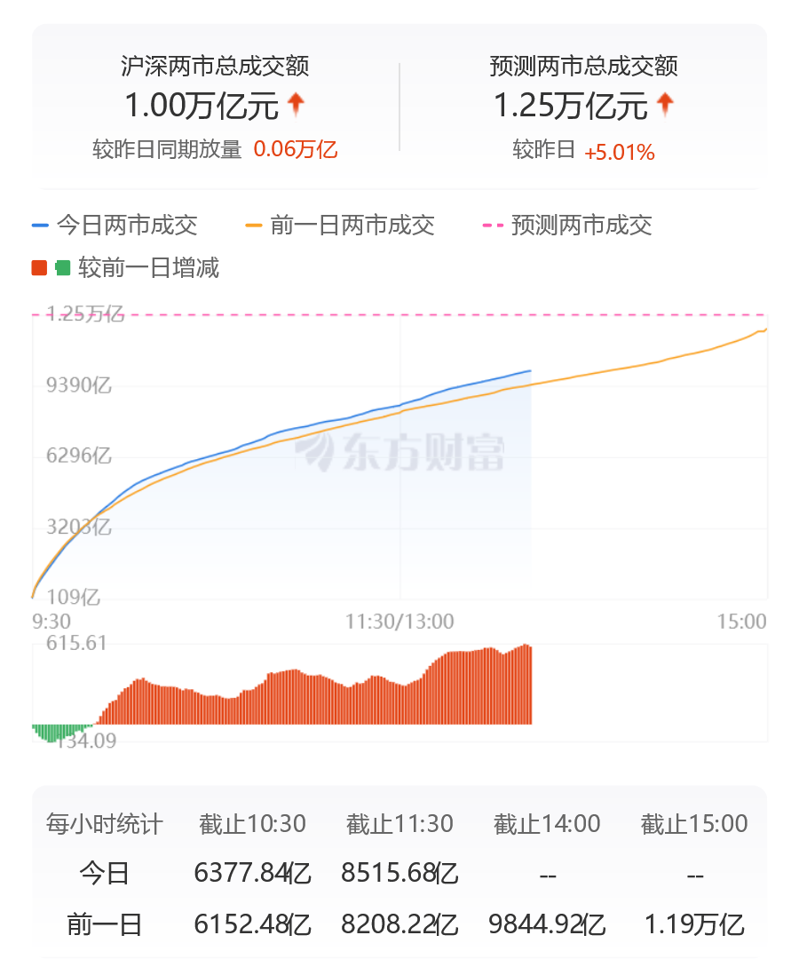 沪深两市成交额连续第3个交易日突破1万亿元,较昨日此时放量近600亿。