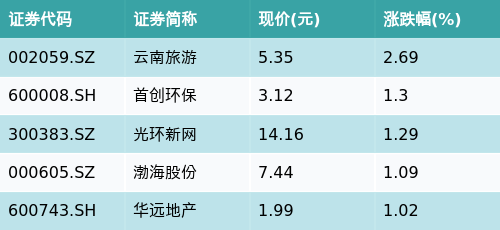 截至收盘,REITs主题涨跌幅最高的五只股票为:云南旅游(002059.SZ)、首创环保(600008.SH)、光环新网(300383.SZ)、渤海股份(000605.SZ)与华远地产(600743.SH)。详情见下表: