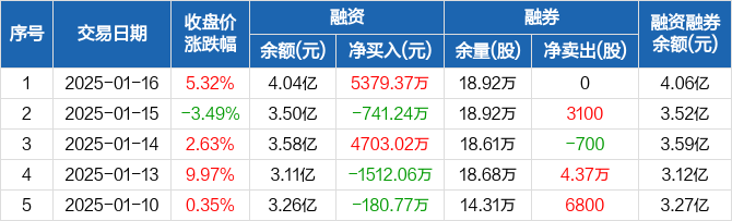 北方铜业融资融券信息显示,2025年1月16日融资净买入5379.37万元;融资余额4.04亿元,创历史新高,较前一日增加15.36%。