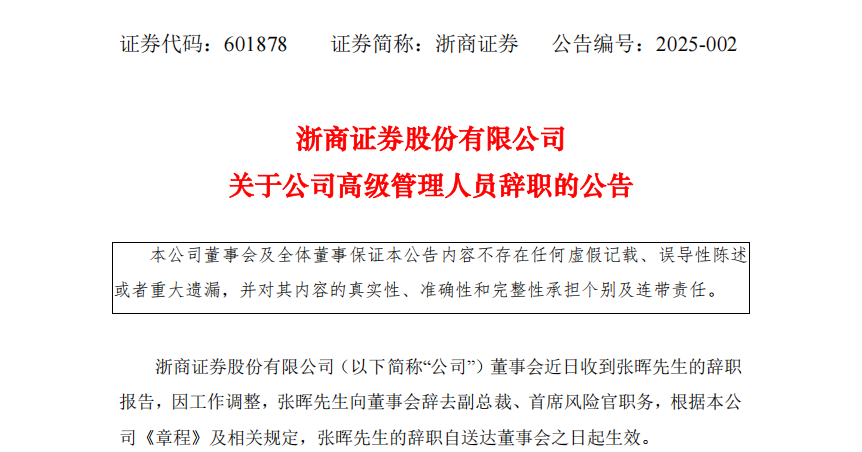 财中社1月17日电1月16日下午,浙商证券(601878)发布高管辞职公告。公告显示,因工作调整,张晖向董事会辞去副总裁、首席风险官职务,根据本公司《章程》及相关规定,张晖的辞职自送达董事会之日起生效。