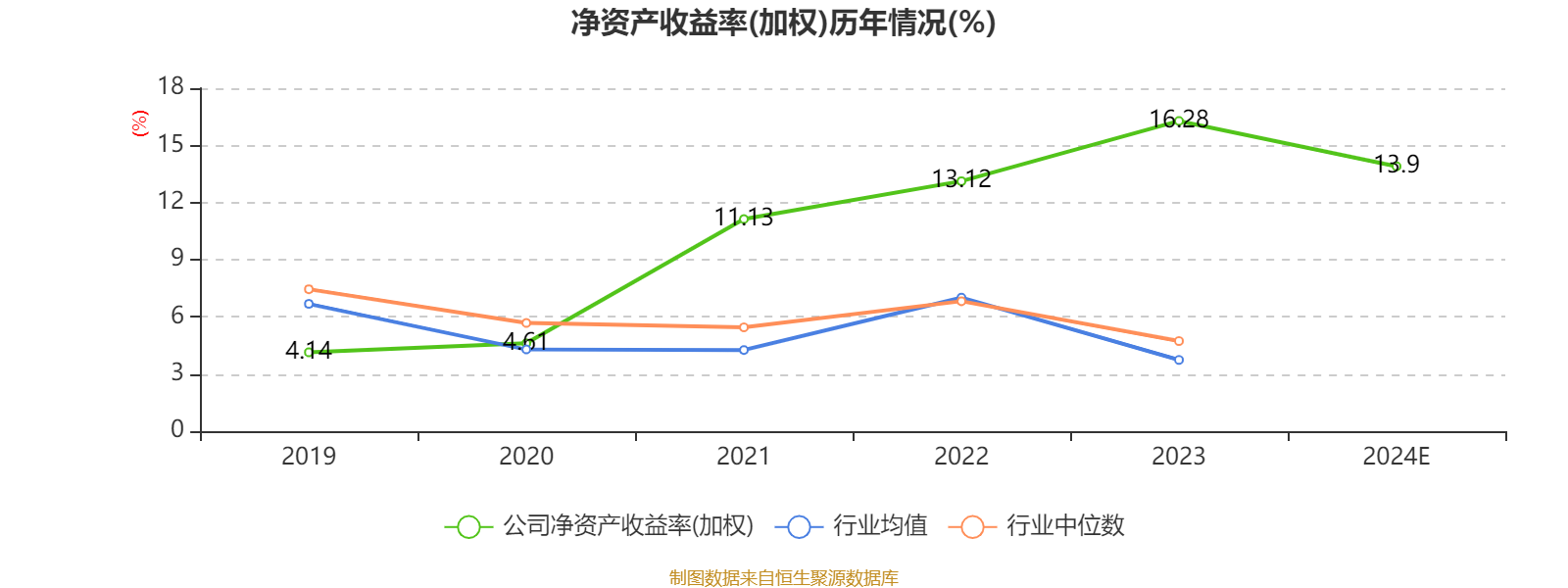 数据显示,2024年公司加权平均净资产收益率为13.9%,较上年同期下降2.38个百分点。