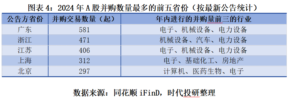 数据显示,2024年A股上市公司并购交易中,按公告方上市公司所处的省份、地市级城市统计(统计口径下同),广东省、浙江省、江苏省年内进行的并购交易分别达581起、471起、406起,是并购活跃度最高的前三个区域。
