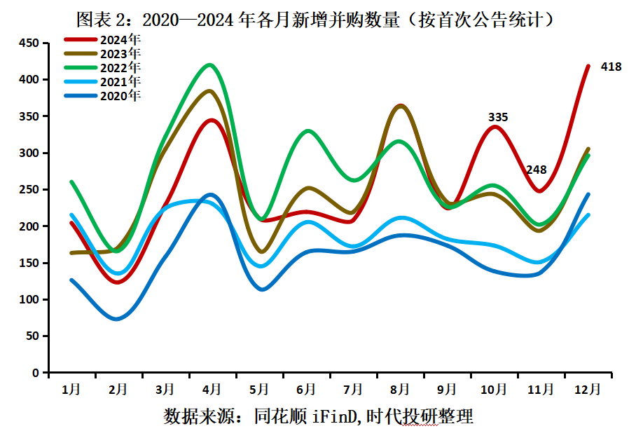 数据显示(数据来源下同),按首次公告统计,2024年10—12月,A股分别新增了335起、248起、418起并购交易,单月新增的并购数量均创过去五年同期新高。