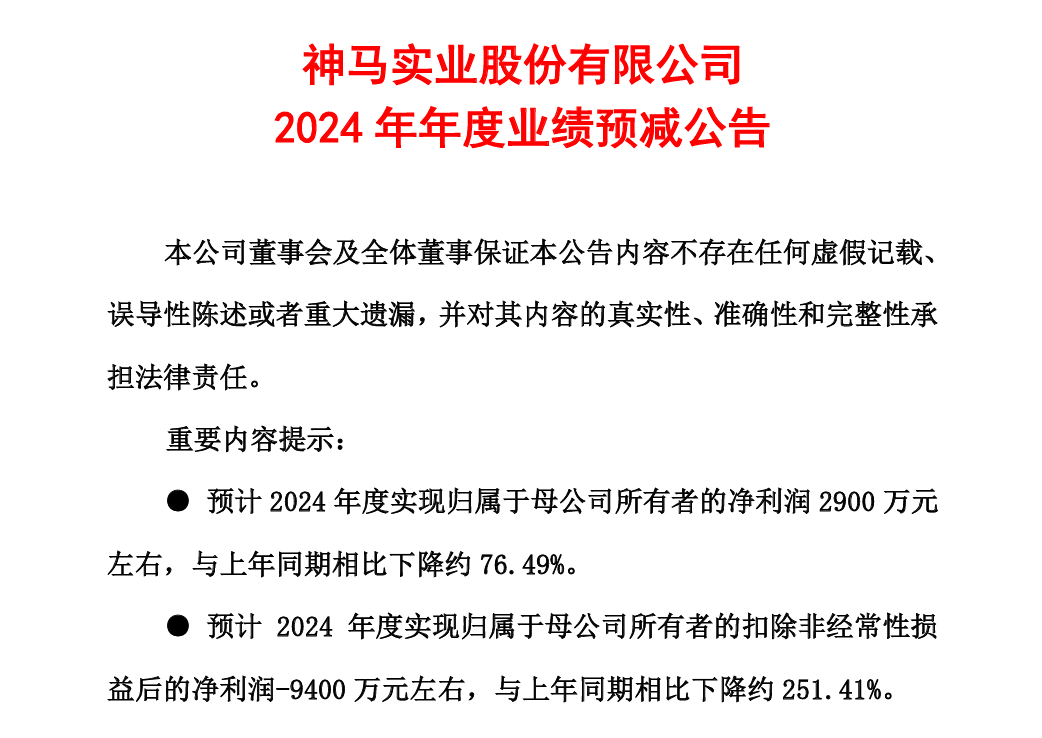 1月19日晚间,神马股份(600810)公告,公司预计2024年度实现归母净利润2900万元左右,同比下降约76.49%;预计实现扣非净利润-9400万元左右,同比下降约251.41%。