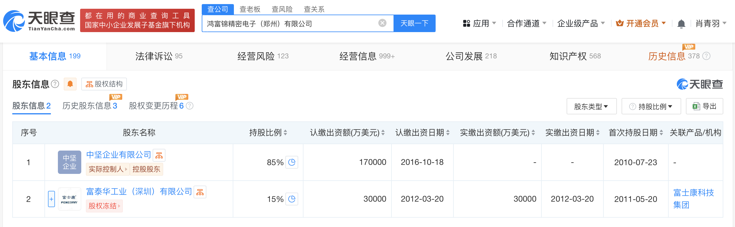 南方财经1月20日电,天眼查App显示,近日,郑州富士康关联公司鸿富锦精密电子(郑州)有限公司发生工商变更,王志文卸任法定代表人、董事长、总经理,由陈连柱接任。该公司成立于2010年7月,注册资本20亿美元,经营范围含集成电路制造、电子元器件制造、电子元器件零售、专用设备修理、电子元器件批发、模具制造、专业设计服务、专用仪器制造等。股东信息显示,该公司由中坚企业有限公司及旗下富泰华工业(深圳)有限公司共同持股。