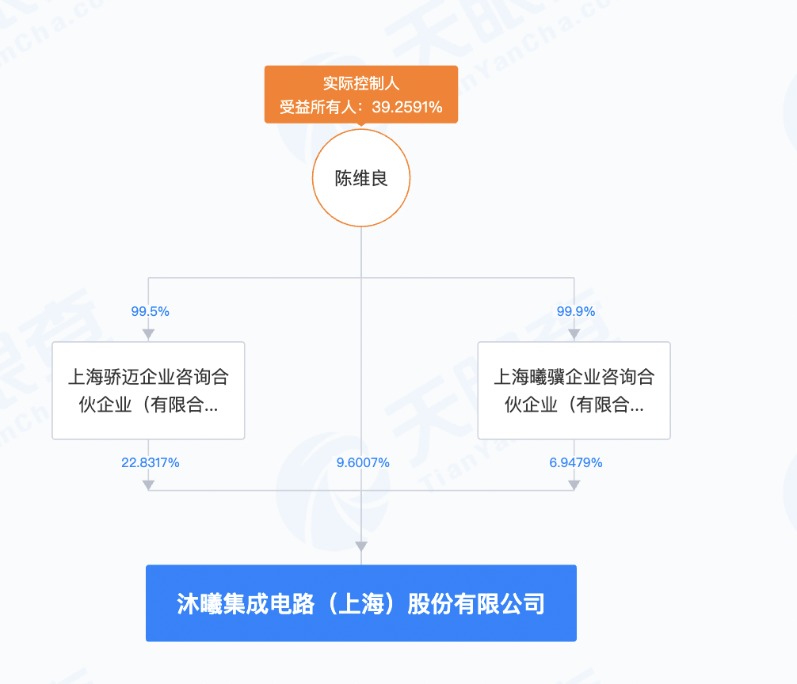 天眼查信息显示:沐曦控股股东为上海骄迈企业咨询合伙企业(有限合伙),持股比例为22.83%;实际控制人为陈维良,受益股份为39.26%。