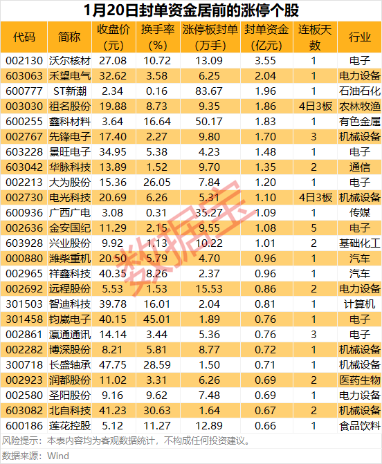 以封单金额计算,13股封单资金超亿元,沃尔核材、禾望电气、ST新潮封单资金居前,分别为3.55亿元、2.04亿元、1.96亿元。