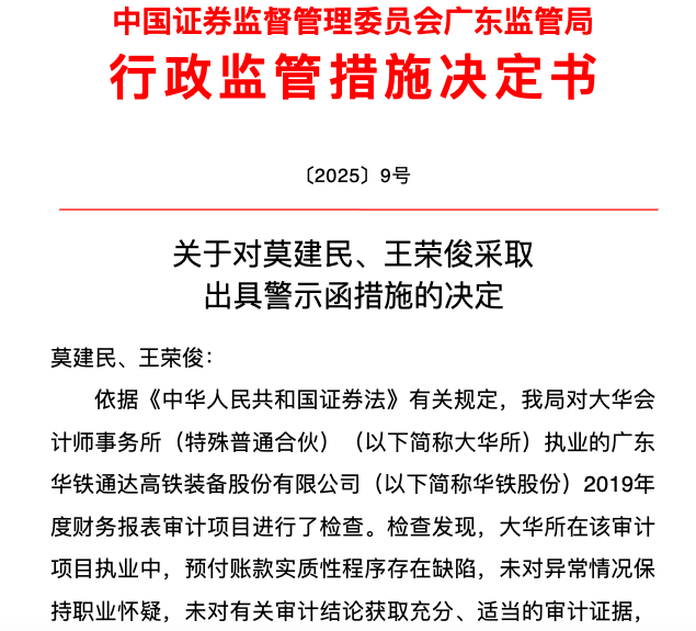 1月20日,广东证监局下发关于对莫建民、王荣俊采取出具警示函措施的决定。大华所在华铁股份审计项目执业中,预付账款实质性程序存在缺陷,未对异常情况保持职业怀疑,未对有关审计结论获取充分、适当的审计证据,莫建民、王荣俊作为华铁股份2019年年报审计项目的签字注册会计师,对上述违规行为负有主要责任。