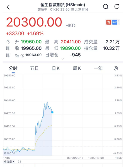恒生指数期货、恒生科技指数期货夜盘,均直线拉升!