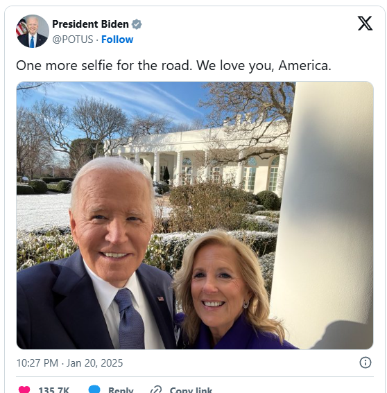 拜登与吉尔·拜登分享了一张充满社交媒体气息的告别照片:在白宫外的自拍。拜登在社交媒体X的帖子中写道:“再来一张自拍,为这次旅程画上句号。”