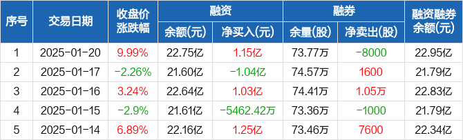 融资方面,当日融资买入5.25亿元,融资偿还4.11亿元,融资净买入1.15亿元,净买入额两市排名第14。融券方面,融券卖出5200股,融券偿还1.32万股,融券余量73.77万股,融券余额1997.69万元。融资融券余额合计22.95亿元。