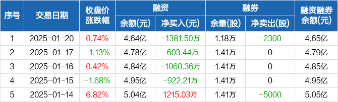 融资方面,当日融资买入1914.56万元,融资偿还3296.06万元,融资净偿还1381.5万元,连续4日净偿还累计3967.5万元。融券方面,融券卖出0股,融券偿还2300股,融券余量1.18万股,融券余额51.11万元。融资融券余额合计4.65亿元。