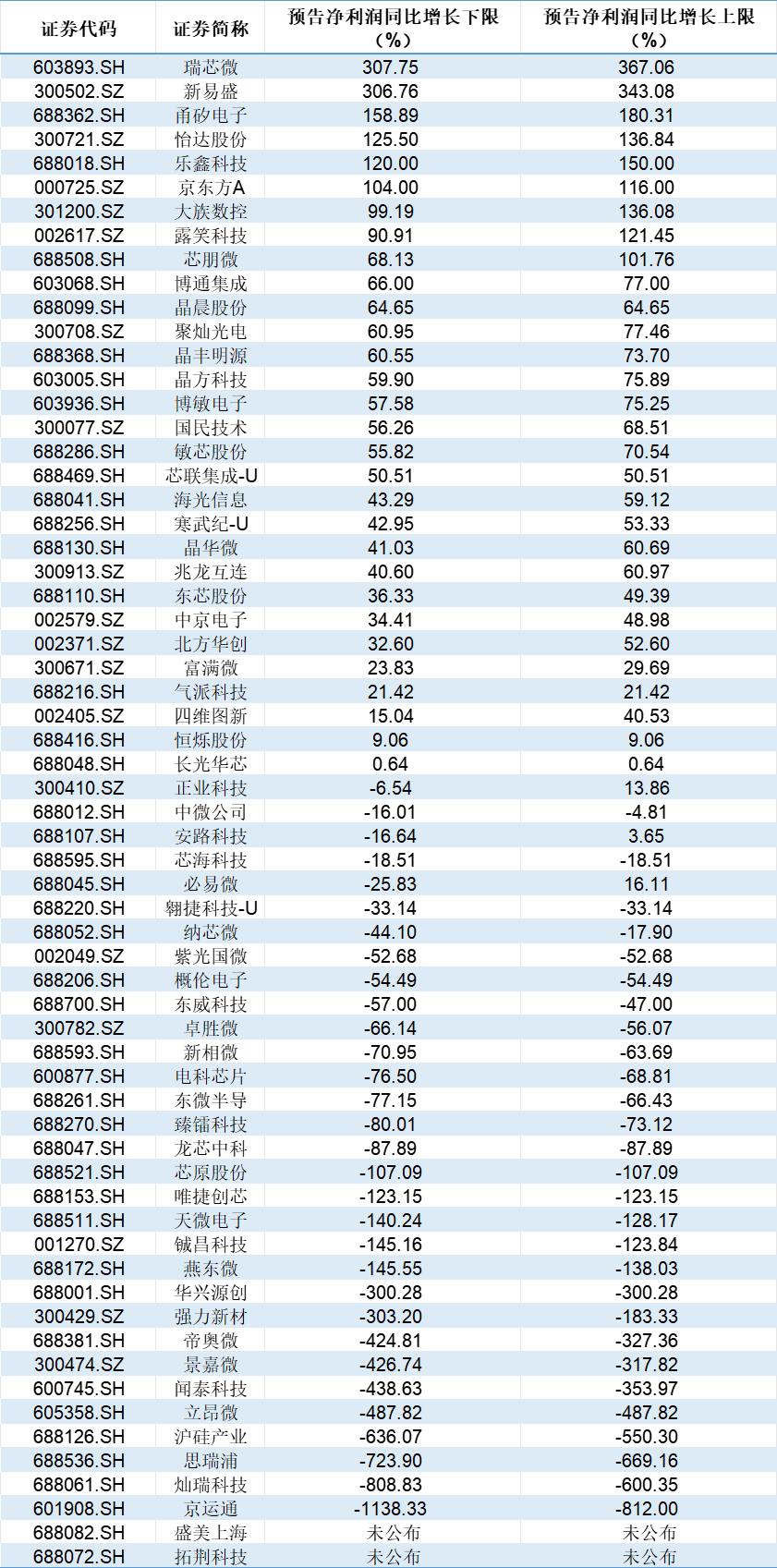 数据显示,已有30家企业业绩预告显示,实现净利润净增长,其中有5家左右公司实现净利润的翻倍式增长,增长幅度最高的是瑞芯微,预计增长307.75%至367.06%。还有不少公司在2024年遇到净利润负增长的情况,京运通降幅预计在1138.33%至812.00%%。