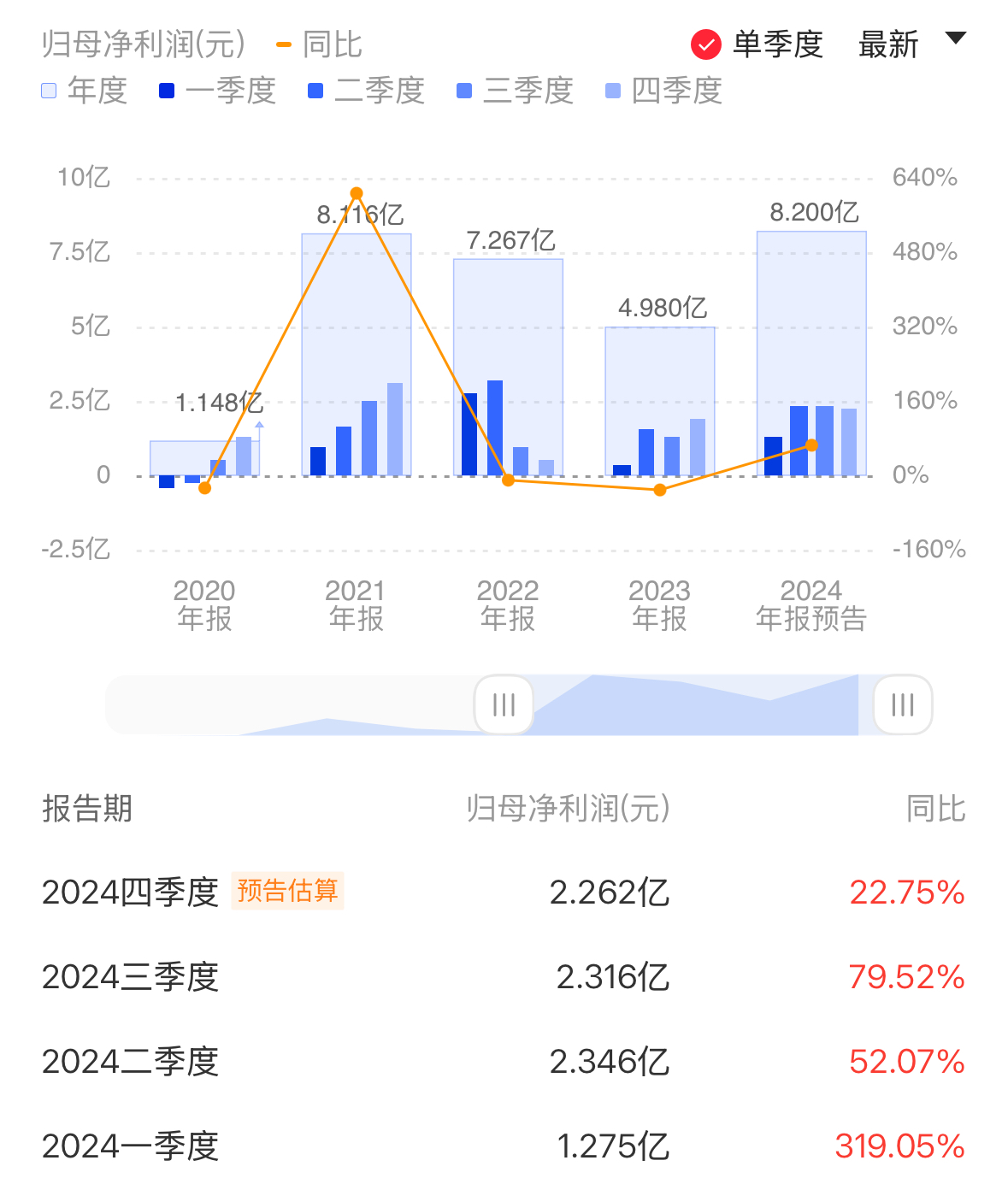 同时预计2024年年度实现归母净利润8.2亿元左右,与上年同期相比将增加3.21亿元左右,同比增长64.65%左右;预计年度归母扣非净利润同比增长92.33%左右。