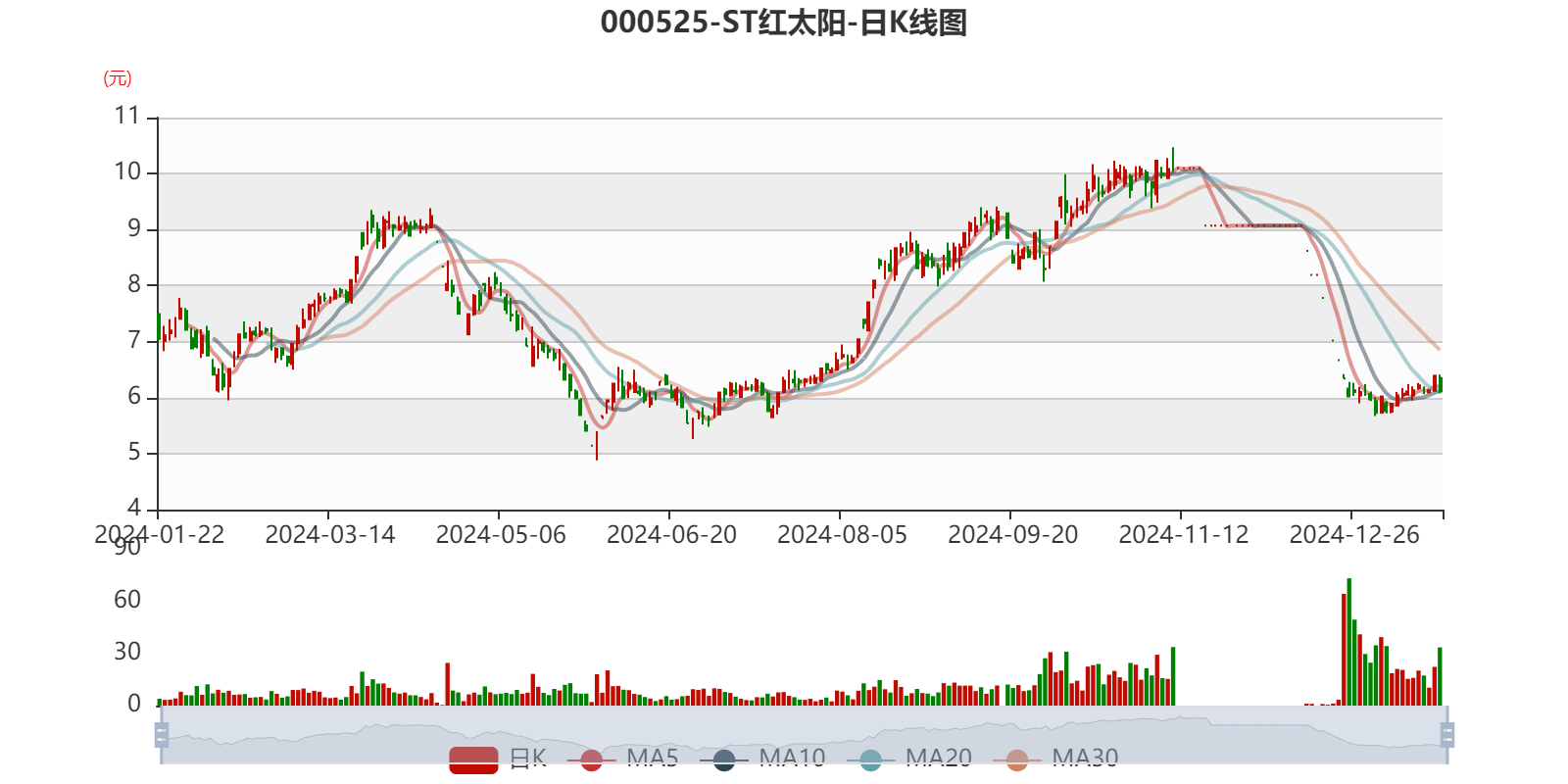 中证智能财讯 ST红太阳(000525)1月20日晚间披露2024年度业绩预告,预计2024年实现营业收入29.5亿元至33.5亿元;归母净利润4.6亿元至6.5亿元,上年同期亏损3.89亿元;扣非净利润亏损7.8亿元至9.7亿元,上年同期亏损8.77亿元;基本每股收益0.35元/股-0.5元/股。以1月20日收盘价计算,ST红太阳目前市盈率(TTM)约为12.2倍-17.24倍,市净率(LF)约8.66倍,市销率(TTM)约2.52倍。