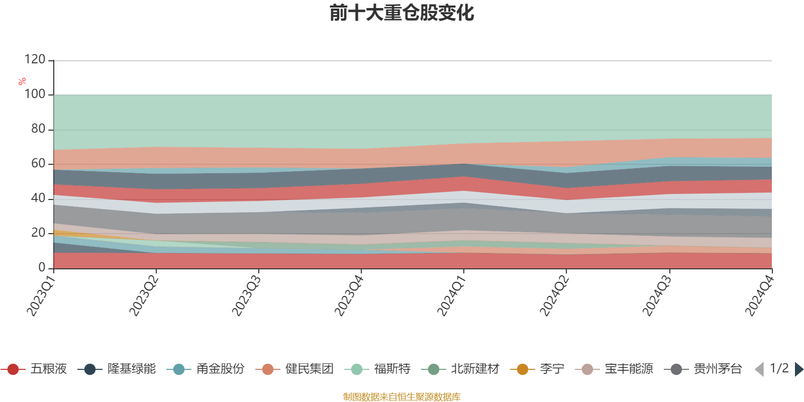 该基金持股集中度较高,且持股标的较为稳定,近2年前十大重仓股集中度长期超过60%。截至2024年四季度末,基金十大重仓股分别是贵州茅台、腾讯控股、招商银行、五粮液、美的集团、香港交易所、宝丰能源、美团-W、中国财险、健民集团。