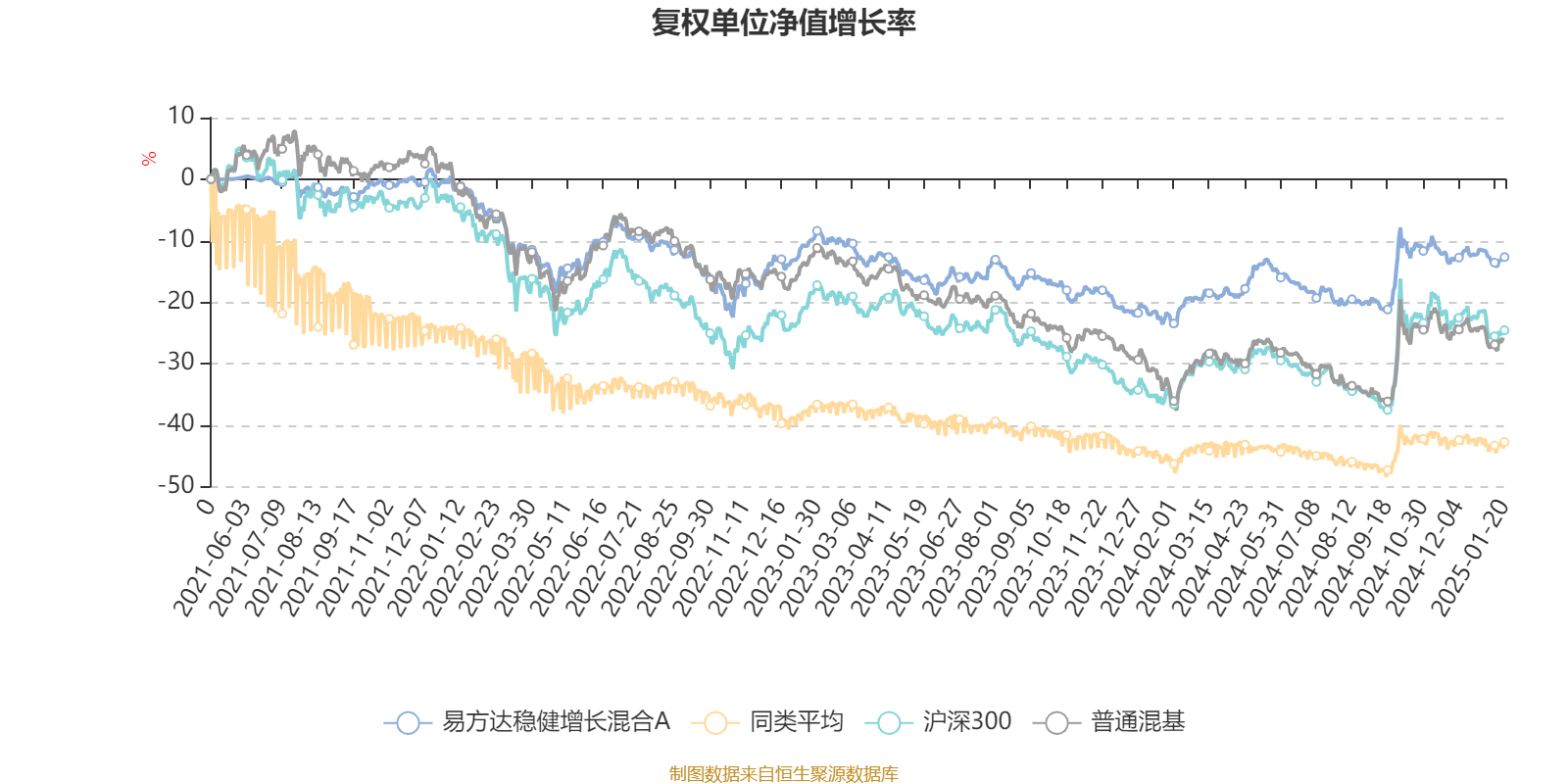 截至1月20日,易方达稳健增长混合A近三个月复权单位净值增长率为-1.73%,位于同类可比基金15/26;近半年复权单位净值增长率为6.38%,位于同类可比基金10/26;近一年复权单位净值增长率为12.74%,位于同类可比基金3/25;近三年复权单位净值增长率为-11.19%,位于同类可比基金9/17。