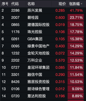 港股恒生物业服务管理指数一度大涨逾4%,位居所有行业板块涨幅之首,恒生内地地产指数、大湾区地产建筑业指数也强势上攻。辰兴发展最高一度飙升逾56%,碧桂园一度涨近30%,绿景中国地产、万科企业等也纷纷大涨。