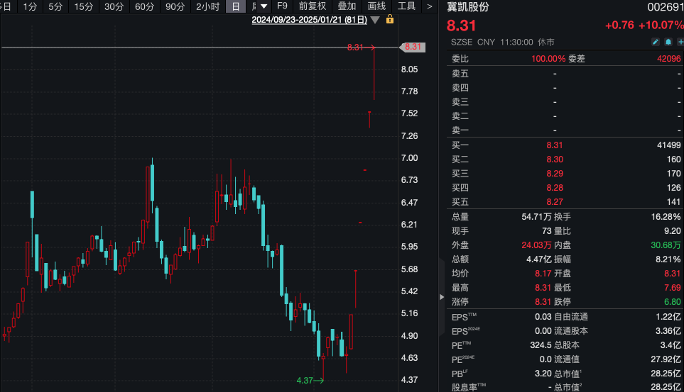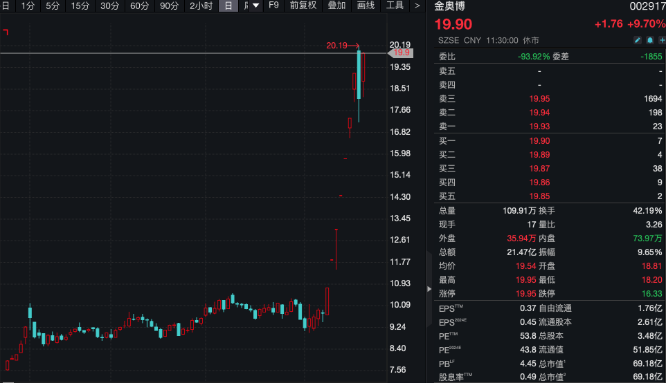 机器人概念股近期持续活跃,连续涨停牛股接连涌现。冀凯股份连续6日涨停,股价创1年多来新高;金奥博此前也连续7日涨停,昨日短暂调整后,今日盘中再度触及涨停;此外,先锋电子连续4日涨停,冀东装备、金智科技均连续2日涨停。