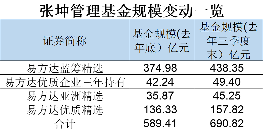 具体来看,截至去年四季度末,易方达蓝筹精选、易方达优质精选、易方达优质企业三年、易方达亚洲精选股票的规模分别为374.98亿元、136.33亿元、42.24亿元、35.87亿元。