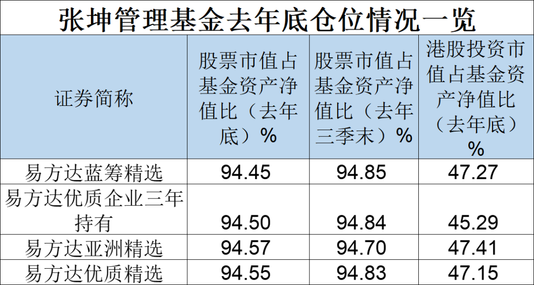 从中国基金报记者整理的数据来看,与此前几个季度的情况类似,张坤管理的4只基金截至去年四季度末维持高仓位运作,股票仓位均在94%以上。