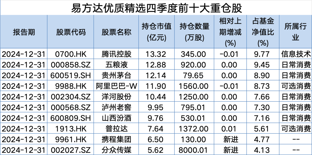 易方达蓝筹精选的持股中,腾讯控股从三季度末的第四大重仓股跃居为头号重仓股。