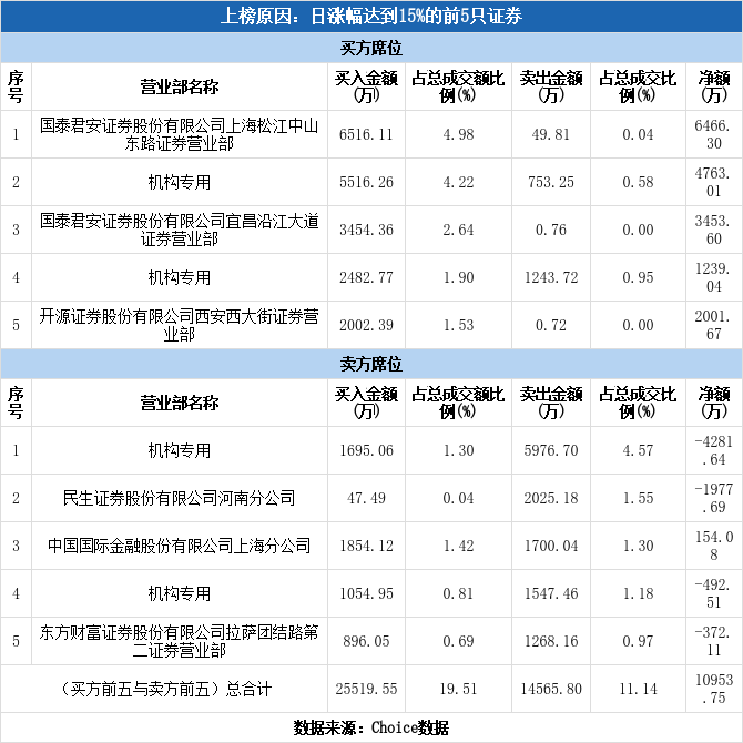 深交所2025年1月21日交易公开信息显示,肇民科技因属于日涨幅达到15%的前5只证券而登上龙虎榜。肇民科技当日报收37.79元,涨跌幅为20.01%,换手率16.04%,振幅19.56%,成交额13.08亿元。