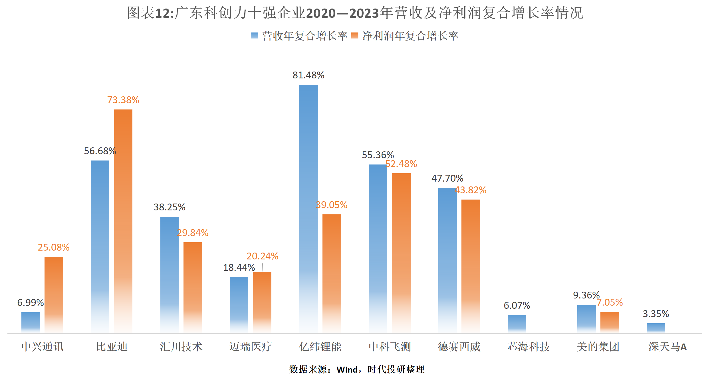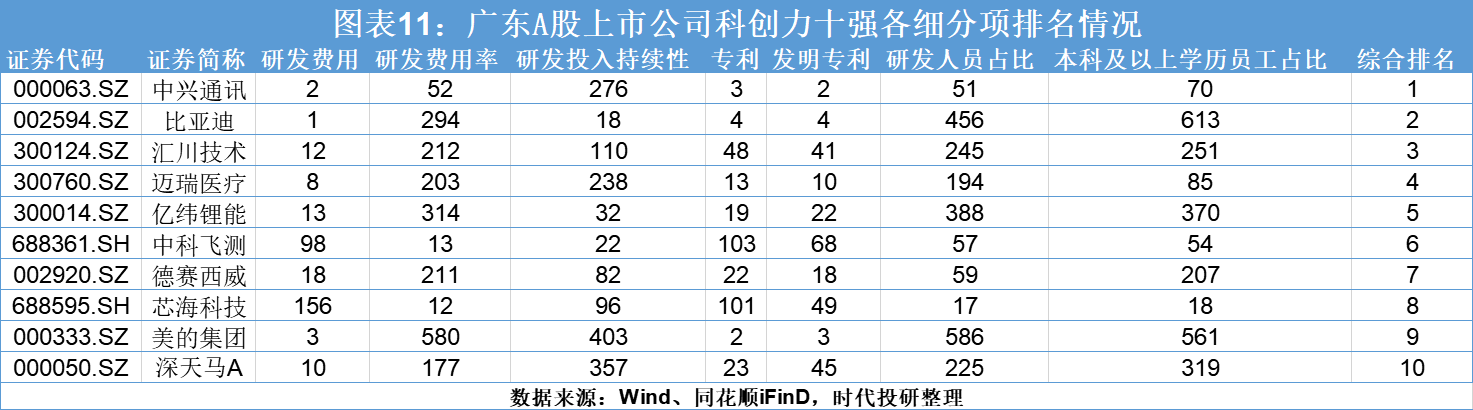 榜单显示,广东A股上市公司科创力排名前十的企业分别为中兴通讯(000063.SZ)、比亚迪(002594.SZ)、汇川技术(300124.SZ)、迈瑞医疗(300760.SZ)、亿纬锂能(300014.SZ)、中科飞测(688361.SH)、德赛西威(002920.SZ)、芯海科技(688595.SH)、美的集团(000333.SZ)、深天马A(000050.SZ)。