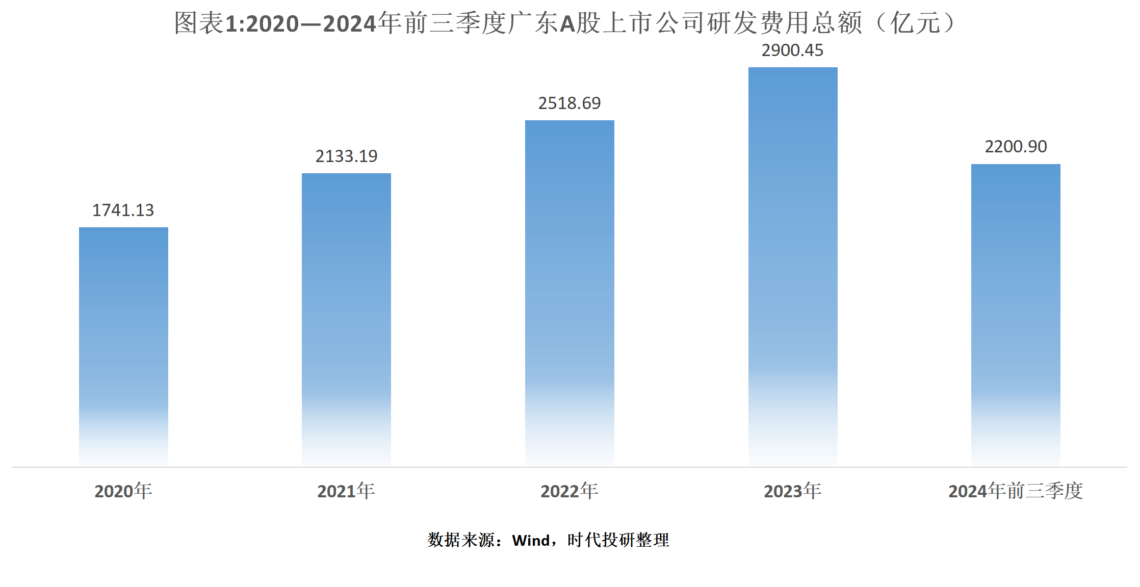 数据显示,2024年前三季度,广东876家A股上市公司的研发费用共计2200.90亿元,同比增长7.53%。从往年的研发费用来看,2020—2023年,上述876家上市公司的研发费用总额分别为1741.13亿元、2133.19亿、2518.69亿元、2900.45亿元,年复合增长率高达18.54%。