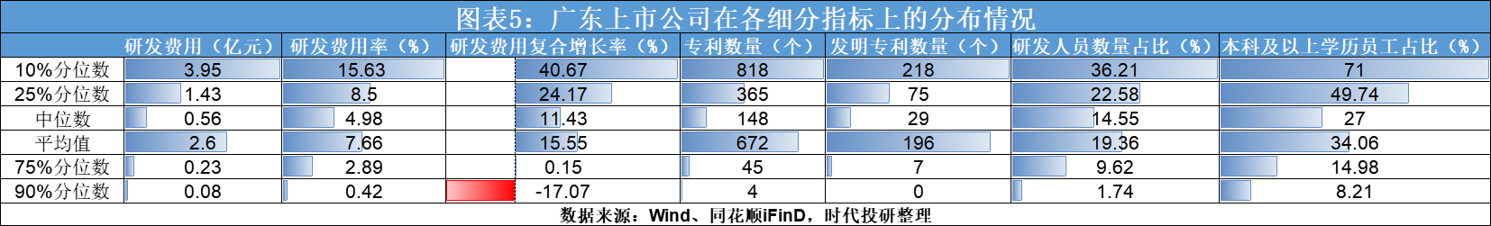 在研发费用、专利数量和发明专利数量方面,均出现平均值远超25%分位数的现象,这表明广东A股上市公司在这三大指标上存在分布不均的问题。