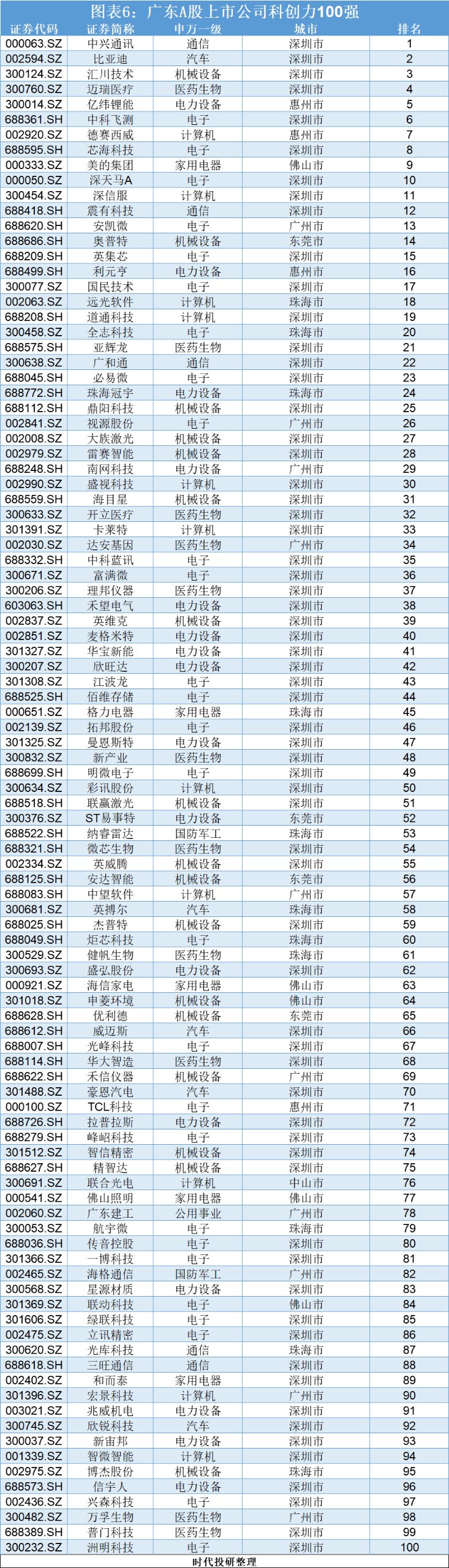 为更好地衡量企业的科创力,时代投研从企业的资金投入、技术积累、人才资源投入三大维度出发,对研发费用等7个细分指标给予不同的权重进行打分排名,制作了广东A股上市公司科创力百强排行榜。