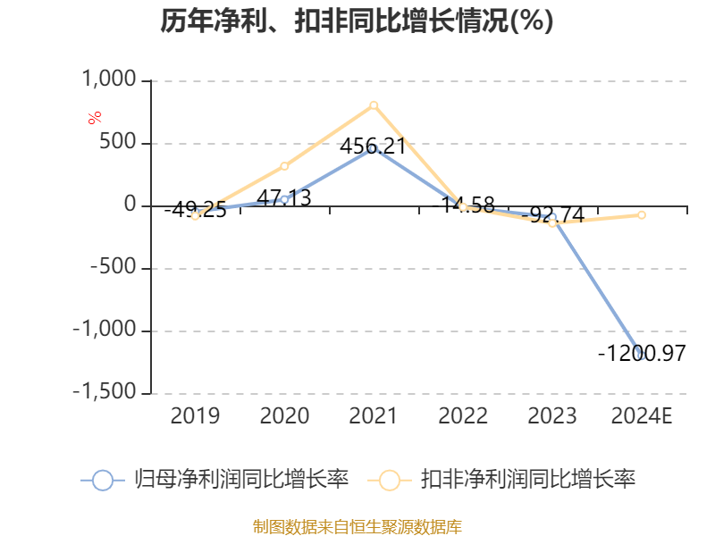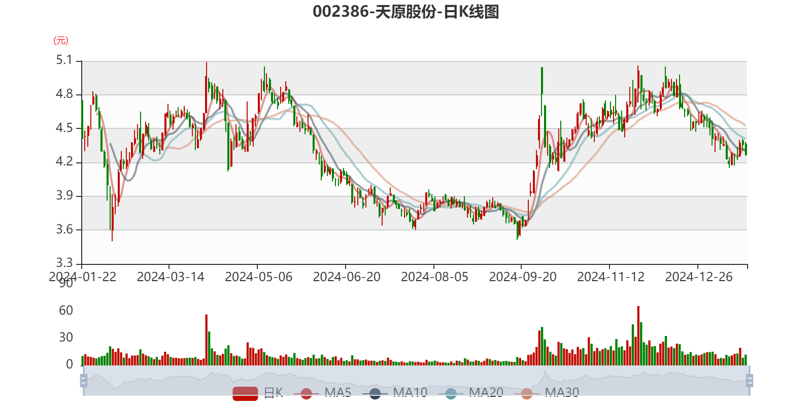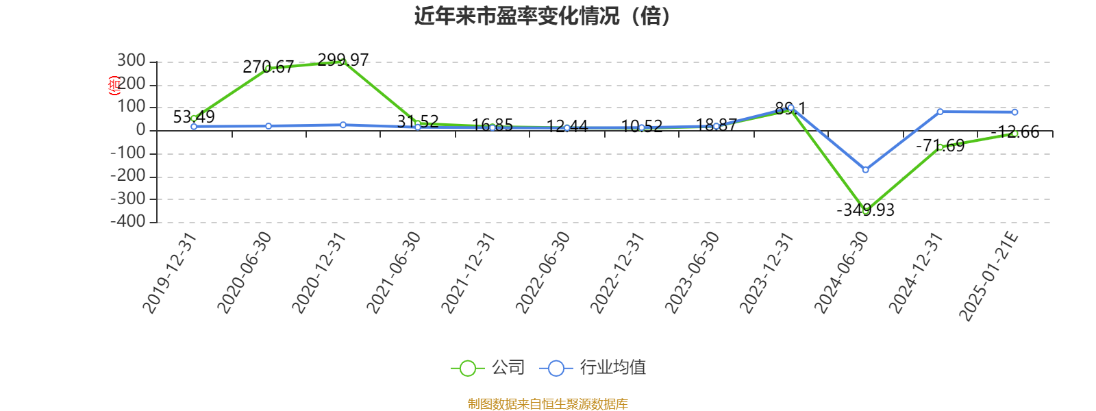 中证智能财讯天原股份(002386)1月21日晚间披露2024年度业绩预告,预计2024年归母净利润亏损4.2亿元至4.6亿元,上年同期盈利3996.47万元;扣非净利润亏损3.9亿元至4.3亿元,上年同期亏损2.33亿元;基本每股收益-0.3227元/股至-0.3534元/股。以1月21日收盘价计算,天原股份目前市盈率(TTM)约为-12.08倍至-13.23倍,市净率(LF)约0.71倍,市销率(TTM)约0.44倍。