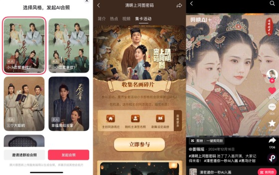 剧集《永夜星河》被报告评为“2024抖音剧集年度营销案例”。该剧加入了抽卡活动。活动中,用户可以边追剧边抽卡,追剧热情被大大满足。相关活动访问量超1.3亿,吸引超700万用户参与,额外带动“永夜星河”相关搜索3500万次。活动吸引了大量站外“自来水”讨论围观,充分满足了粉丝价值和体验。《庆余年2》《清明上河图密码》则加入了AI换脸合照玩法,用户和主演广泛参与,带动剧集热度上涨。