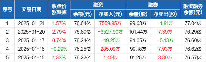 融资方面,当日融资买入4.54亿元,融资偿还3.79亿元,融资净买入7559.95万元。融券方面,融券卖出1.78万股,融券偿还3.59万股,融券余量99.63万股,融券余额3991.18万元。融资融券余额合计77.04亿元。
