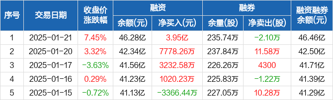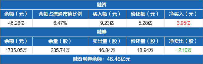 融资方面,当日融资买入9.23亿元,融资偿还5.28亿元,融资净买入3.95亿元,净买入额创12个月新高,连续4日净买入累计5.15亿元。融券方面,融券卖出16.84万股,融券偿还18.94万股,融券余量235.74万股,融券余额1735.05万元。融资融券余额合计46.46亿元。