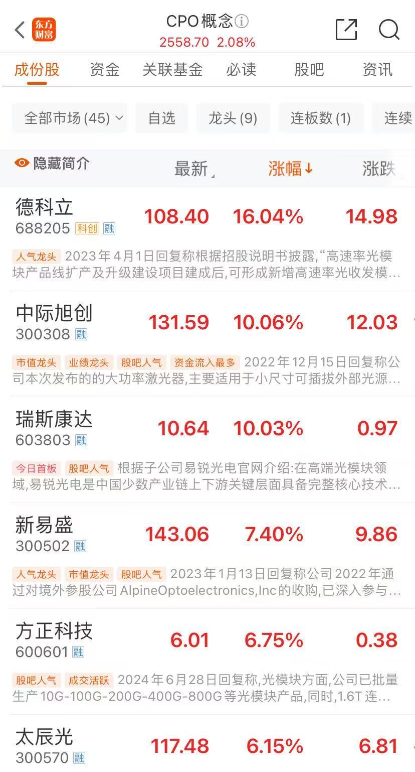 光模块三剑客中际旭创、新易盛、天孚通信联手大涨,其中,中际旭创上涨9.99%,成交额为80.4亿元,居A股第一。欧陆通、胜宏科技涨超13%,德科立涨超12%,还有英维克、太辰光、博创科技……批量个股创出历史新高。另外,沪电股份、沃尔核材、方正科技等概念股都大涨。