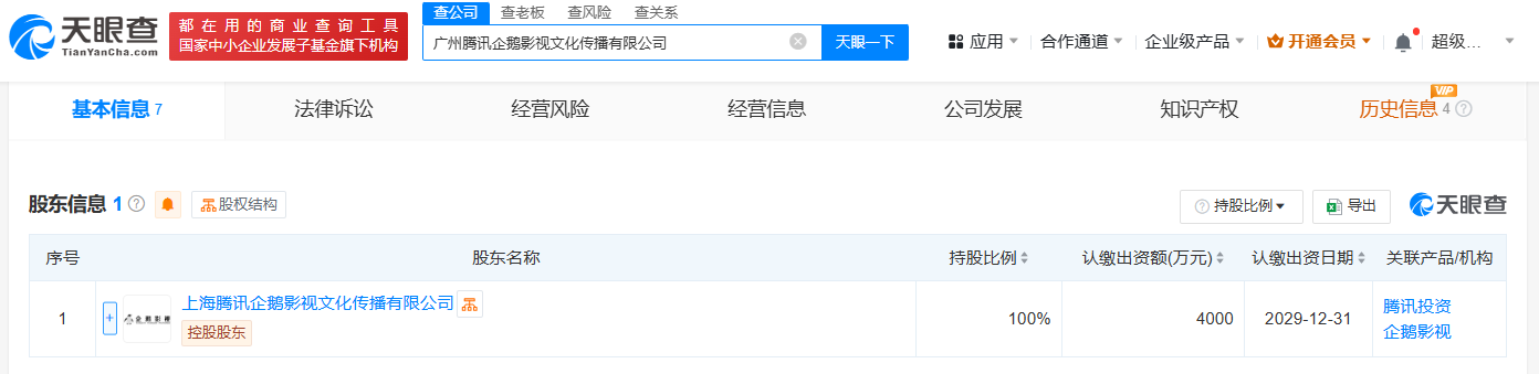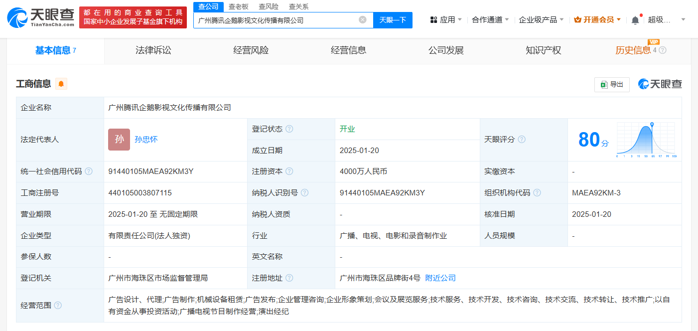 每经AI快讯,天眼查App显示,近日,广州腾讯企鹅影视文化传播有限公司成立,法定代表人为孙忠怀,注册资本4000万人民币,经营范围包括广告制作、广告发布、企业管理咨询、企业形象策划、广播电视节目制作经营、演出经纪等,由上海腾讯企鹅影视文化传播有限公司全资持股。