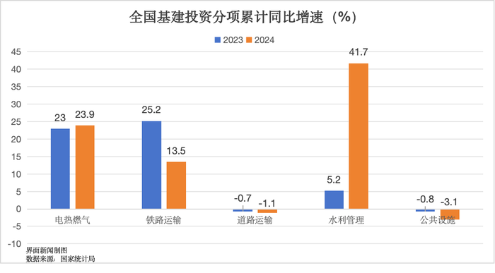 国家统计局数据显示,2024年,中国基础设施建设投资同比增长9.2%,增速比上年加快近1个百分点,不含电力投资的基建投资同比增长4.4%,增速比上年放缓1.5个百分点。