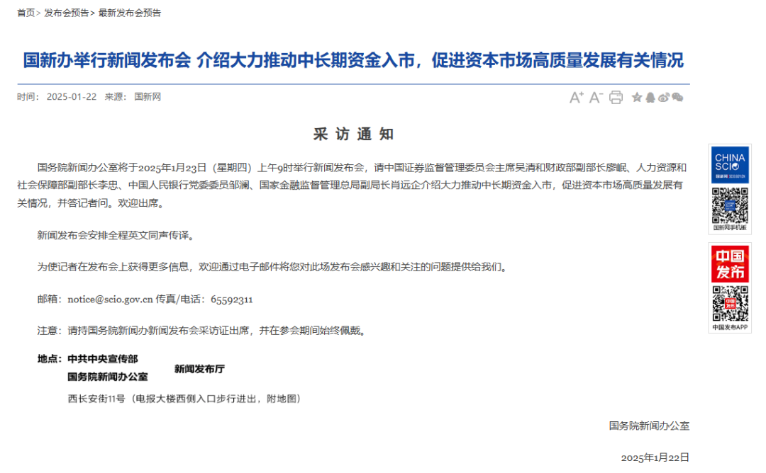 国务院新闻办公室将于2025年1月23日(星期四)上午9时举行新闻发布会,请中国证券监督管理委员会主席吴清和财政部副部长廖岷、人力资源和社会保障部副部长李忠、中国人民银行党委委员邹澜、国家金融监督管理总局副局长肖远企介绍大力推动中长期资金入市,促进资本市场高质量发展有关情况,并答记者问。欢迎出席。