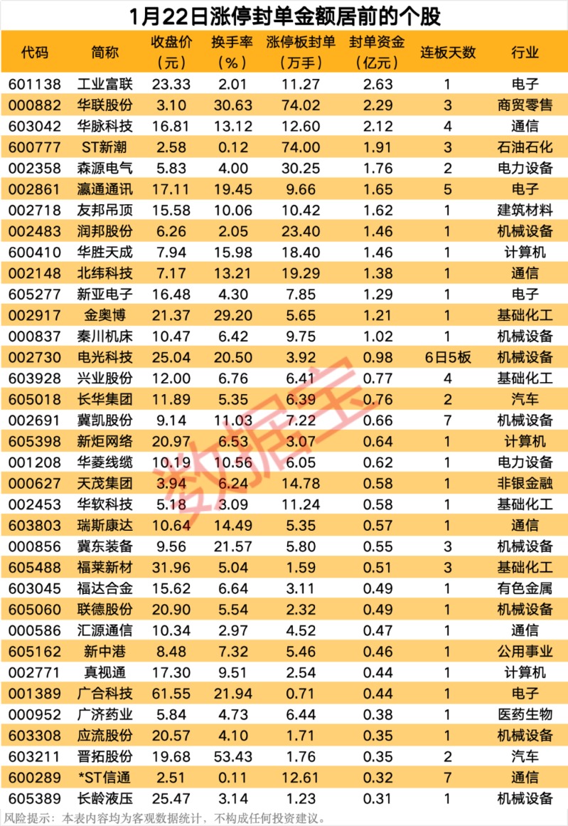 以封单金额计算,13股封单金额超亿元,工业富联、华联股份、华脉科技封单金额居前,分别为2.63亿元、2.29亿元、2.12亿元。