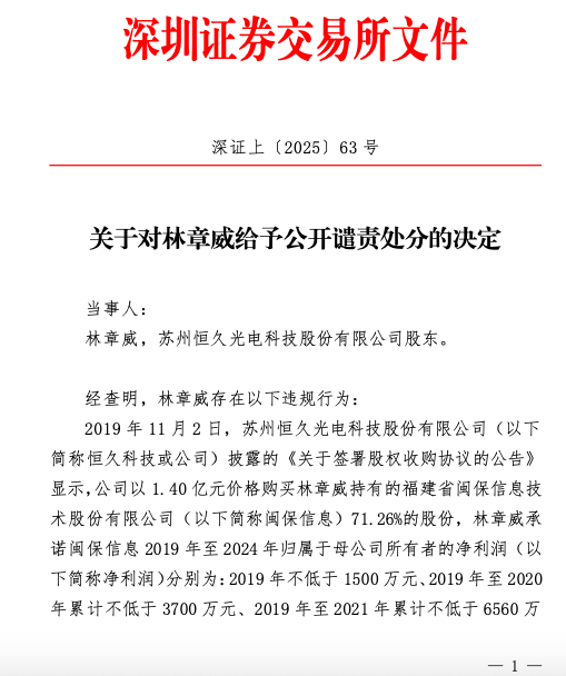 1月22日,深圳证券交易所下发关于对林章威给予公开谴责处分的决定。苏州恒久光电科技股份有限公司(以下简称“ST恒久”、“恒久科技”或“公司”)股东林章威因未履行业绩补偿,被深交所公开谴责。