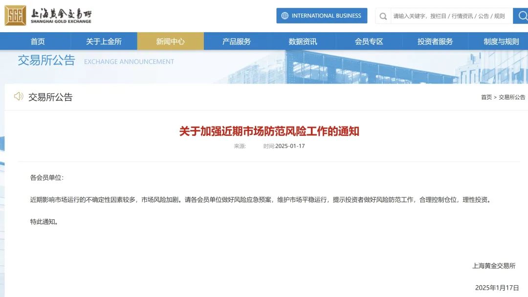 上海黄金交易所近日发布公告称,近期影响市场运行的不确定性因素较多,市场风险加剧。请各会员单位做好风险应急预案,维护市场平稳运行,提示投资者做好风险防范工作,合理控制仓位,理性投资。