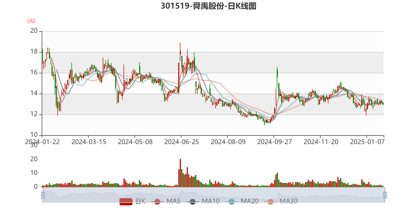 中证智能财讯舜禹股份(301519)1月22日晚间披露2024年度业绩预告,预计2024年归母净利润1200万元至1800万元,同比下降73.42%-82.28%;扣非净利润预计-500万元至500万元。以1月22日收盘价计算,舜禹股份目前市盈率(TTM)约为118.29倍-177.43倍,市净率(LF)约1.46倍,市销率(TTM)约3.35倍。